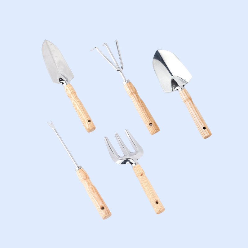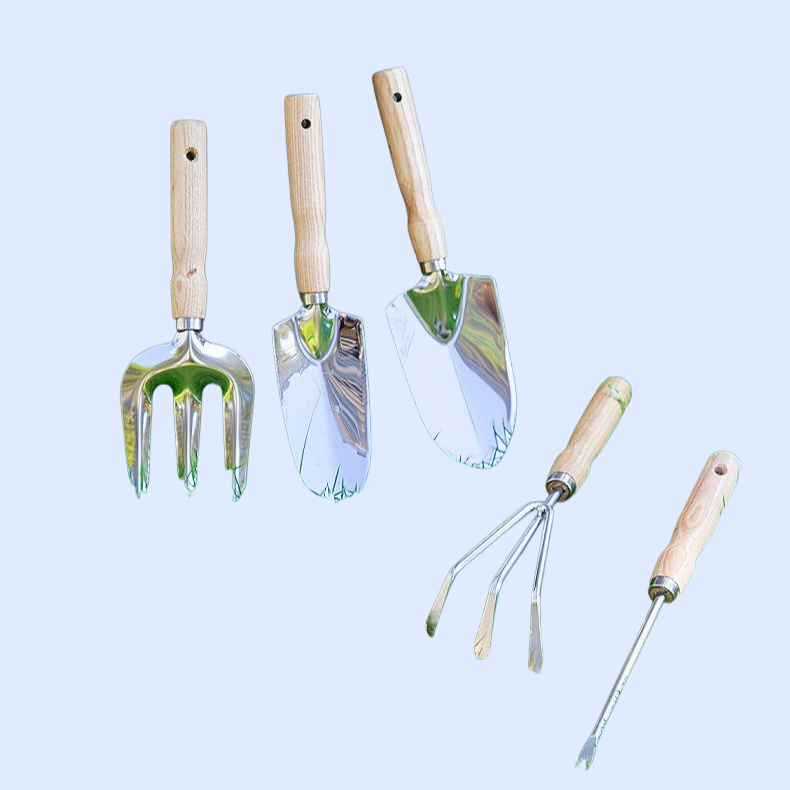 Multi-purpose gardening tool set for sea-hunting, digging, planting, and hoeing; durable materials; ergonomic design; suitable for vegetable and flower gardening.